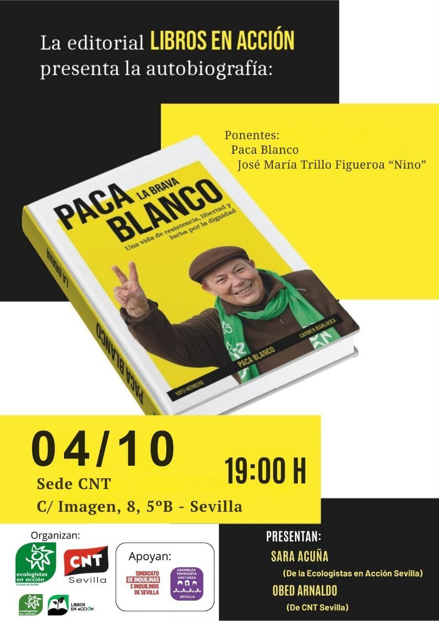 • La presentación del libro en Sevilla tendrá lugar el sábado, 04 de octubre a las 19:00 en la sede CNT. Calle Imagen, 8. 5ºB acompañará a la autora José María Trillo Figueroa «Nino».