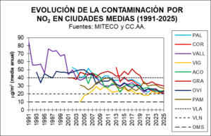 Otras trece ciudades analizadas también han superado durante el año pasado el nuevo límite legal de NO2, destacando las estaciones Felisa Munárriz en Pamplona (27), Olivereta de València (26), Torneo en Sevilla (25), María Díaz de Haro en Bilbao (25), Oeste en Vigo (25), Palacio de Deportes en Oviedo (24) y Plaza de Pontevedra en A Coruña (23). Las ciudades que registraron concentraciones de NO2 más bajas fueron Palma (Foners, 22), Córdoba (Avenida Al-Nasir, 22), Zaragoza (Avenida de Soria, 21), Burgos (Avenida de Cantabria, 21), Valladolid (Arco de Ladrillo, 20) y Santa Cruz de Tenerife (Piscina Municipal, 20), las dos últimas sólo unas décimas por encima del nuevo límite legal a cumplir en 2030.