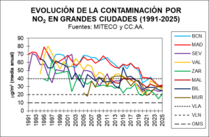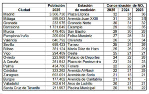 Otras trece ciudades analizadas también han superado durante el año pasado el nuevo límite legal de NO2, destacando las estaciones Felisa Munárriz en Pamplona (27), Olivereta de València (26), Torneo en Sevilla (25), María Díaz de Haro en Bilbao (25), Oeste en Vigo (25), Palacio de Deportes en Oviedo (24) y Plaza de Pontevedra en A Coruña (23). Las ciudades que registraron concentraciones de NO2 más bajas fueron Palma (Foners, 22), Córdoba (Avenida Al-Nasir, 22), Zaragoza (Avenida de Soria, 21), Burgos (Avenida de Cantabria, 21), Valladolid (Arco de Ladrillo, 20) y Santa Cruz de Tenerife (Piscina Municipal, 20), las dos últimas sólo unas décimas por encima del nuevo límite legal a cumplir en 2030.