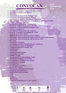 La organización anima a su base social, a colectivos aliados y al conjunto de la ciudadanía a participar activamente en la manifestación del 8M y a llenar las calles de Sevilla de reivindicación, dignidad y esperanza transformadora.