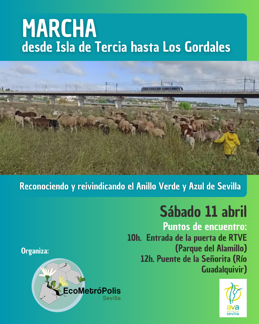 Ecometrópolis Sevilla y AVA Sevilla organizan este sábado, 11 de abril, una marcha desde Isla de Tercia hasta Los Gordales para reconocer y reivndicar el Anillo Verde y Azul de Sevilla. El citado anillo es verde y azul porque trata de recuperar, no solo los espacios verdes, sino las zonas de agua y vinculadas a la red de ejes fluviales.